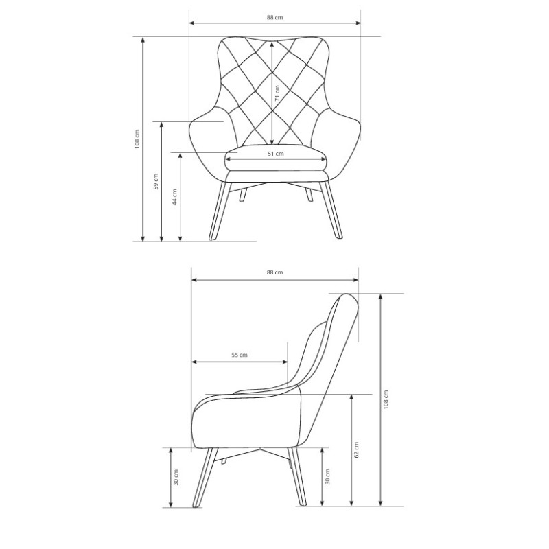 - Mebel wolnostojący: Fotel tapicerowany jest wybraną tkaniną na całej powierzchni, dzięki czemu możesz go swobodnie ustawić w dowolnym miejscu pomieszczenia.