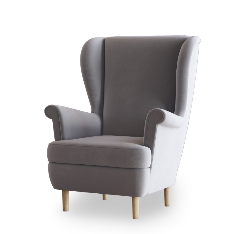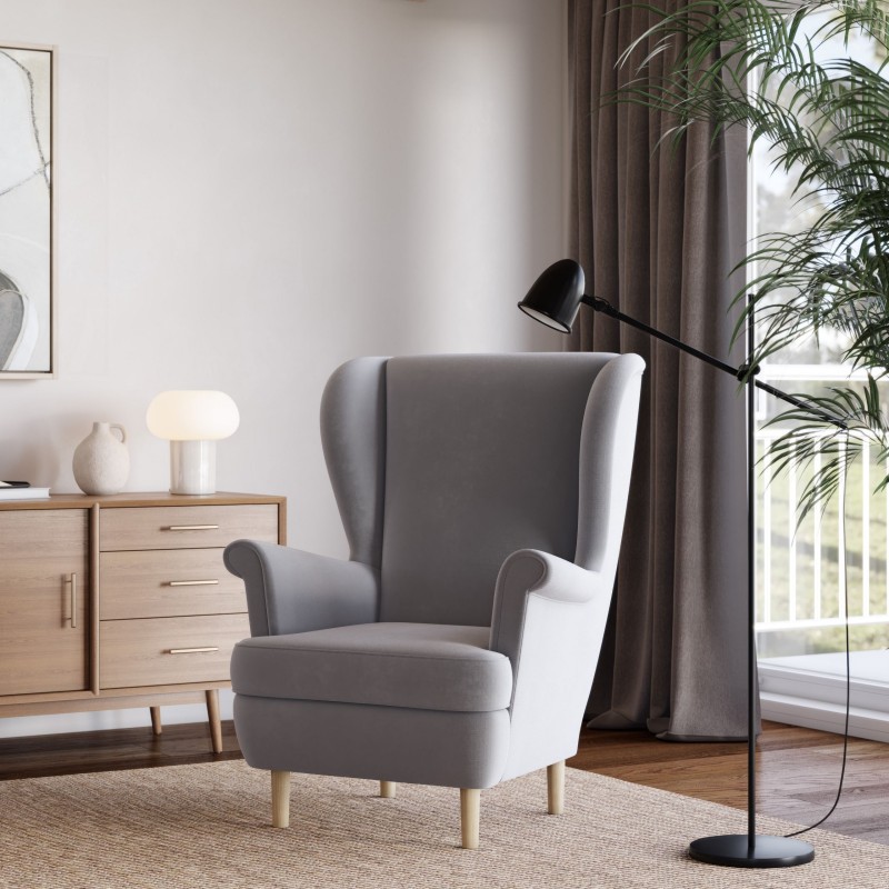 Fotel LENTIO klasyczny jasnoszary kolor, tkanina plusz velvet, wygodny i stylowy uszak