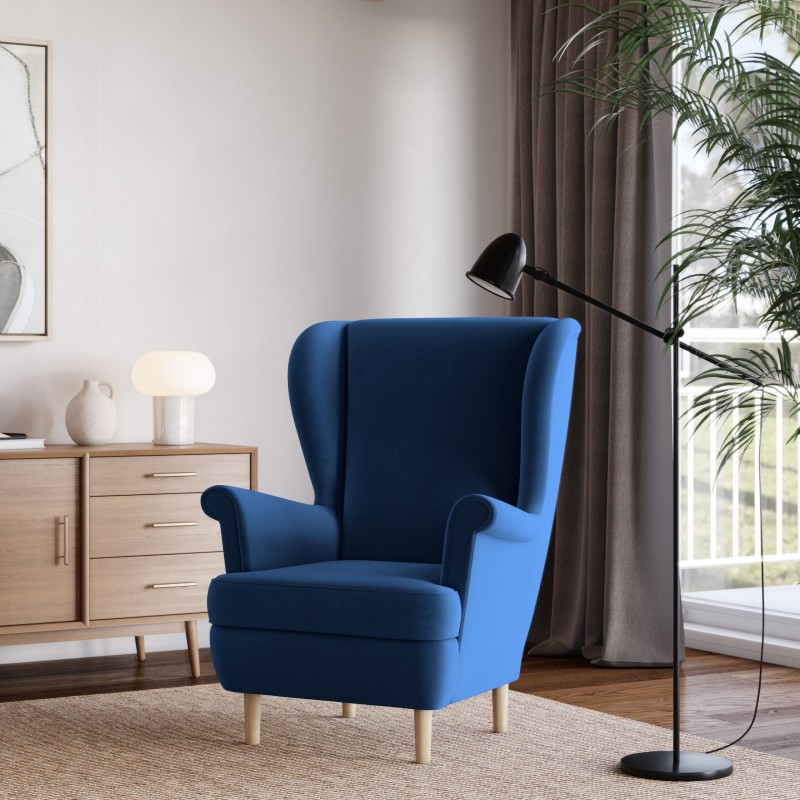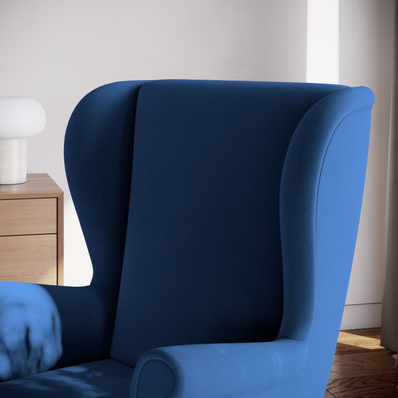 Luksusowy fotel LENTIO stylowy uszak w niebieskiej tkaninie, plusz velvet
