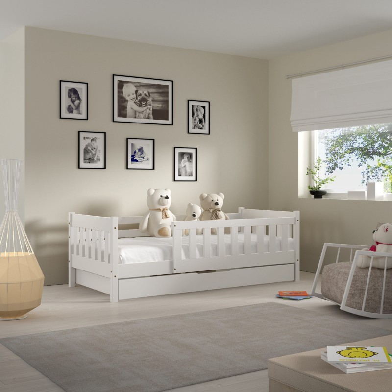 - Pojedyncze łóżko dziecięce wraz z praktyczną szufladą w zestawie, idealne do przechowywania pościeli, zabawek lub dziecięcych akcesoriów.