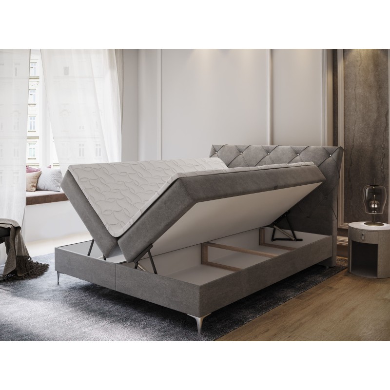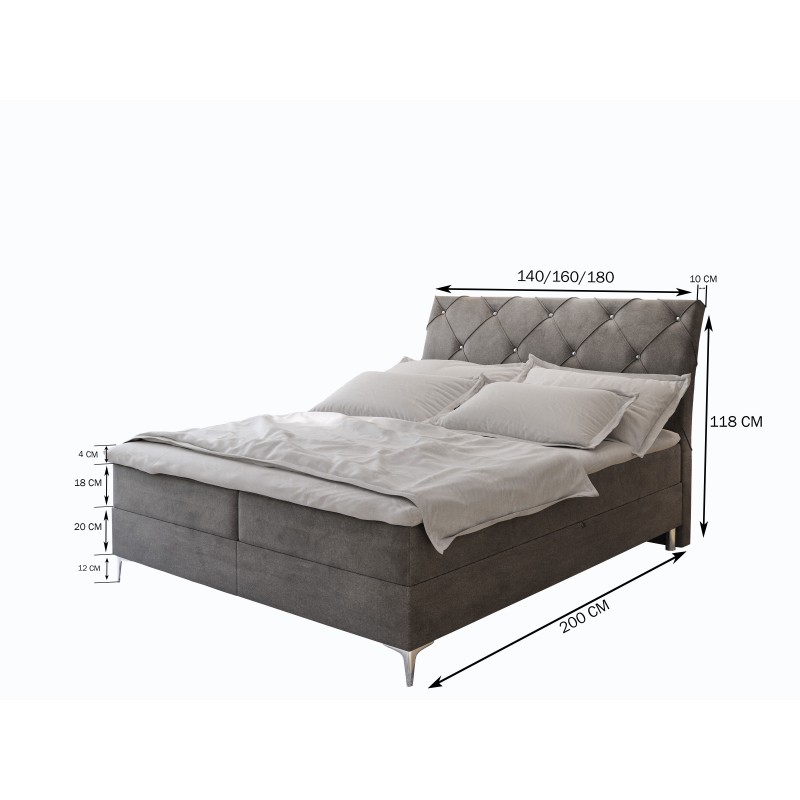 Eleganckie, wysokie metalowe nóżki to nie tylko element dekoracyjny, ale również gwarancja stabilności i trwałości. Łóżko posiada wyjątkowo wygodny, wbudowany materac o grubości 18 cm, który jest stabilnie przymocowany do skrzyń łóżka, zapewnia doskonałe wsparcie dla Twojego ciała.