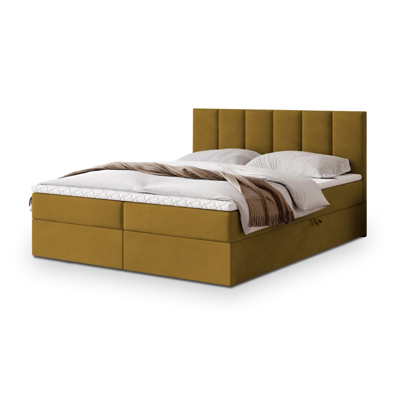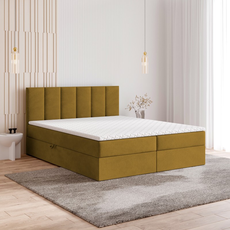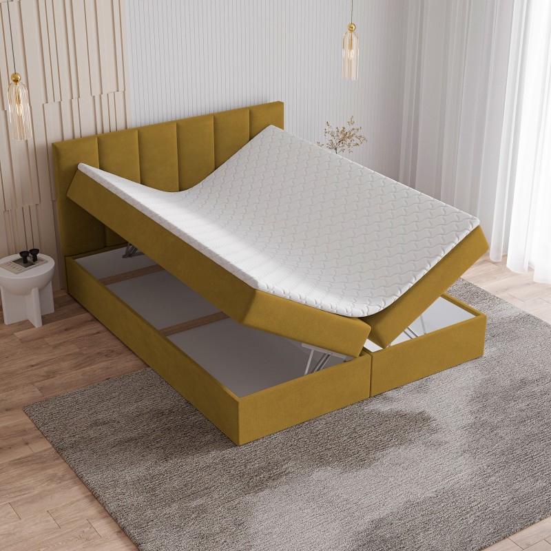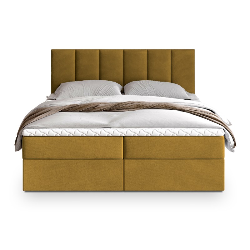 Serce łóżka stanowi materac bonellowy. To rozwiązanie, które zapewnia doskonałe podparcie sylwetki, odpowiednie rozłożenie ciężaru i komfortową pozycję przez całą noc. Dwa przestronne schowki umieszczone w podstawie łóżka bez trudu pomieszczą kołdry, poduszki, sezonową odzież czy inne domowe tekstylia.