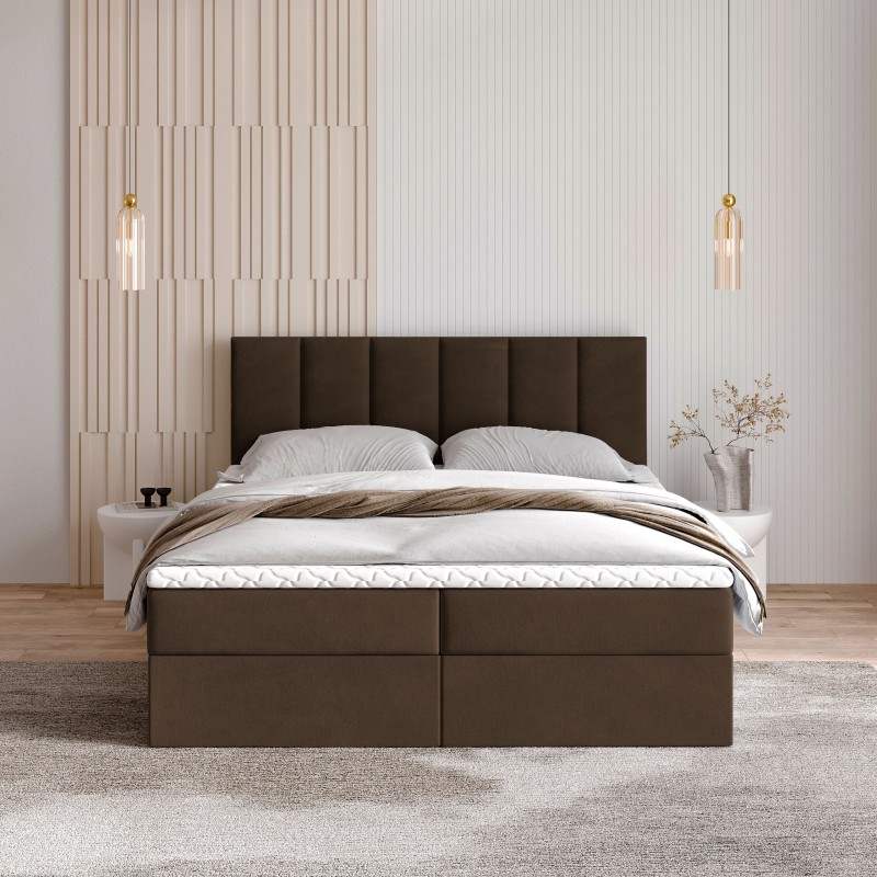 Serce łóżka stanowi materac bonellowy. To rozwiązanie, które zapewnia doskonałe podparcie sylwetki, odpowiednie rozłożenie ciężaru i komfortową pozycję przez całą noc. Dwa przestronne schowki umieszczone w podstawie łóżka bez trudu pomieszczą kołdry, poduszki, sezonową odzież czy inne domowe tekstylia.