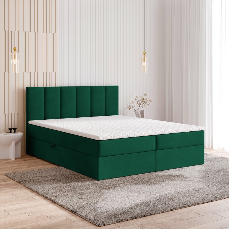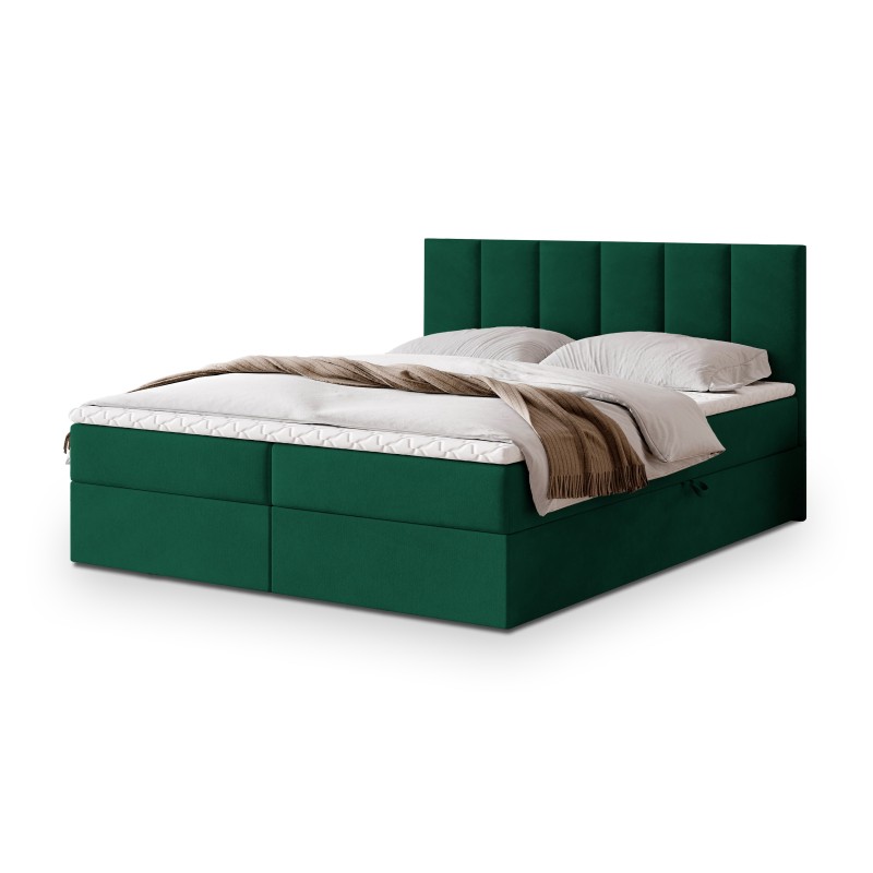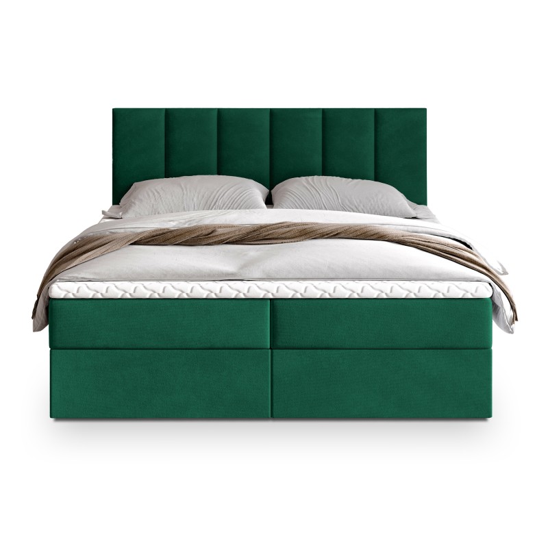Serce łóżka stanowi materac bonellowy. To rozwiązanie, które zapewnia doskonałe podparcie sylwetki, odpowiednie rozłożenie ciężaru i komfortową pozycję przez całą noc. Dwa przestronne schowki umieszczone w podstawie łóżka bez trudu pomieszczą kołdry, poduszki, sezonową odzież czy inne domowe tekstylia.
