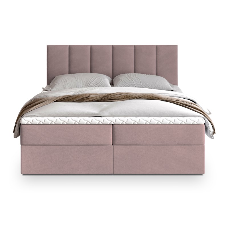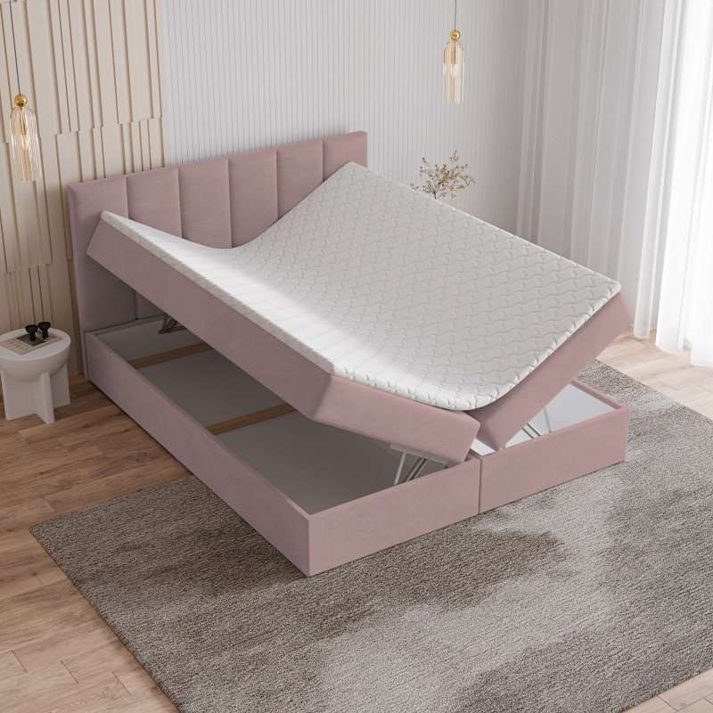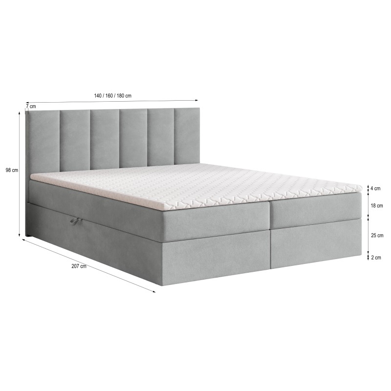 Serce łóżka stanowi materac bonellowy. To rozwiązanie, które zapewnia doskonałe podparcie sylwetki, odpowiednie rozłożenie ciężaru i komfortową pozycję przez całą noc. Dwa przestronne schowki umieszczone w podstawie łóżka bez trudu pomieszczą kołdry, poduszki, sezonową odzież czy inne domowe tekstylia.