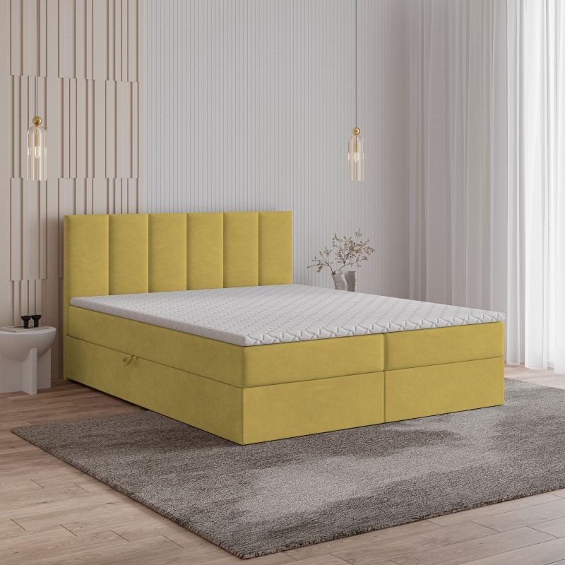 Serce łóżka stanowi materac bonellowy. To rozwiązanie, które zapewnia doskonałe podparcie sylwetki, odpowiednie rozłożenie ciężaru i komfortową pozycję przez całą noc. Dwa przestronne schowki umieszczone w podstawie łóżka bez trudu pomieszczą kołdry, poduszki, sezonową odzież czy inne domowe tekstylia.