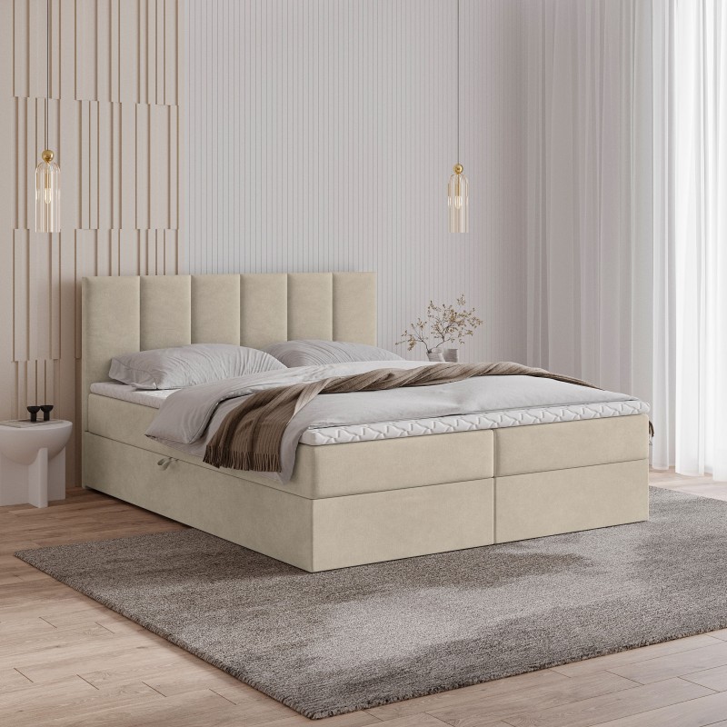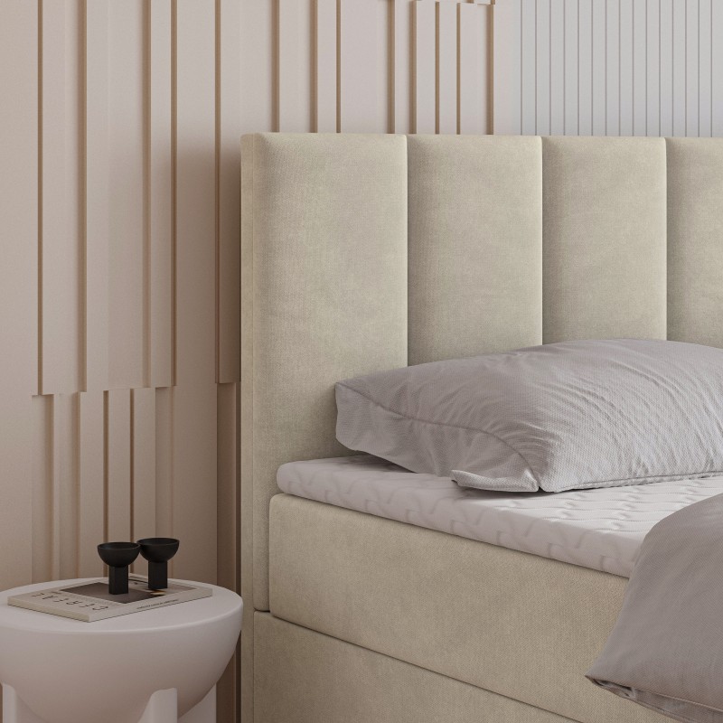 Serce łóżka stanowi materac bonellowy. To rozwiązanie, które zapewnia doskonałe podparcie sylwetki, odpowiednie rozłożenie ciężaru i komfortową pozycję przez całą noc. Dwa przestronne schowki umieszczone w podstawie łóżka bez trudu pomieszczą kołdry, poduszki, sezonową odzież czy inne domowe tekstylia.