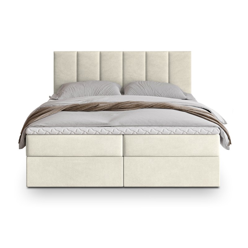 Serce łóżka stanowi materac bonellowy. To rozwiązanie, które zapewnia doskonałe podparcie sylwetki, odpowiednie rozłożenie ciężaru i komfortową pozycję przez całą noc. Dwa przestronne schowki umieszczone w podstawie łóżka bez trudu pomieszczą kołdry, poduszki, sezonową odzież czy inne domowe tekstylia.