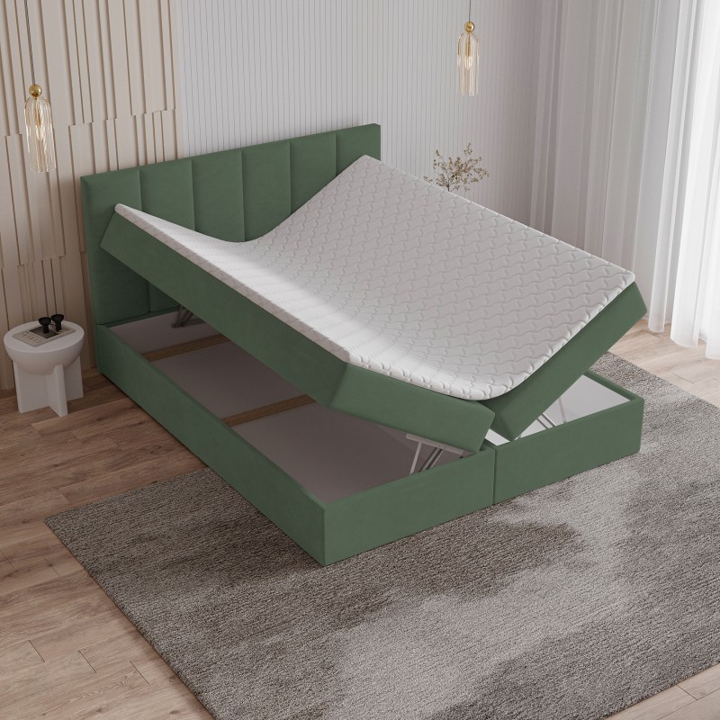 Serce łóżka stanowi materac bonellowy. To rozwiązanie, które zapewnia doskonałe podparcie sylwetki, odpowiednie rozłożenie ciężaru i komfortową pozycję przez całą noc. Dwa przestronne schowki umieszczone w podstawie łóżka bez trudu pomieszczą kołdry, poduszki, sezonową odzież czy inne domowe tekstylia.