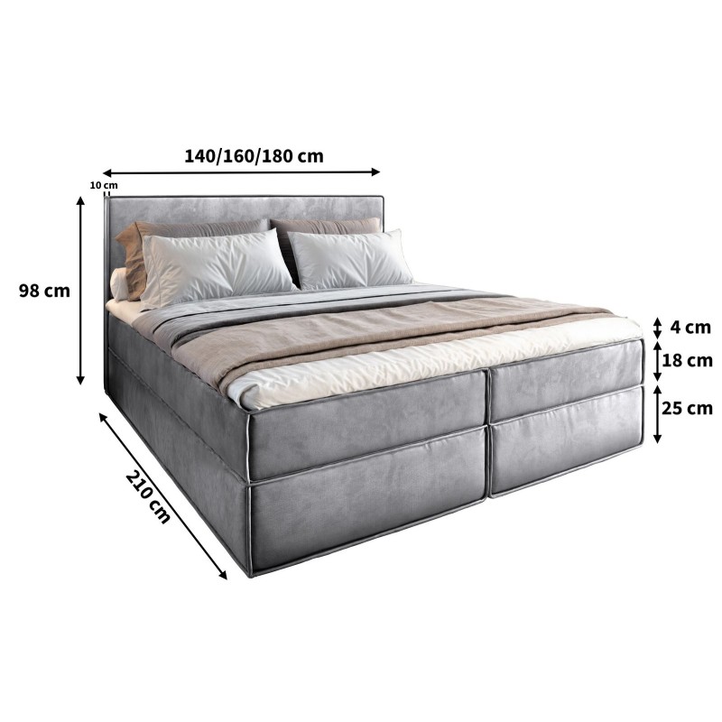 Klasyczna forma łóżka została tu podkreślona stylową tkaniną i wygodnym wezgłowiem, które zachęca do relaksu z książką czy porannej kawy. Wbudowany materac bonellowy odpowiada za komfortowy sen i odpowiednie podparcie kręgosłupa, a dla większej wygody możesz dołożyć opcjonalny topper – wyrównujący powierzchnię spania i ułatwiający utrzymanie czystości. Wnętrze łóżka kryje praktyczne pojemniki na pościel i inne domowe tekstylia, a solidne, niskie nóżki dodają mu nowoczesnej lekkości i stabilności.