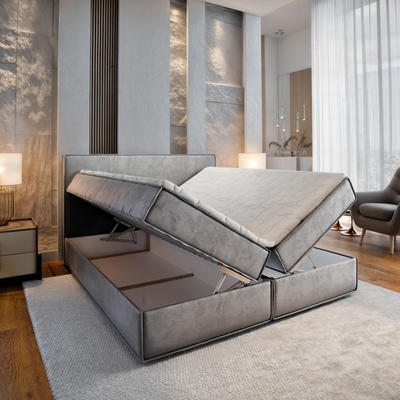 Klasyczna forma łóżka została tu podkreślona stylową tkaniną i wygodnym wezgłowiem, które zachęca do relaksu z książką czy porannej kawy. Wbudowany materac bonellowy odpowiada za komfortowy sen i odpowiednie podparcie kręgosłupa, a dla większej wygody możesz dołożyć opcjonalny topper – wyrównujący powierzchnię spania i ułatwiający utrzymanie czystości. Wnętrze łóżka kryje praktyczne pojemniki na pościel i inne domowe tekstylia, a solidne, niskie nóżki dodają mu nowoczesnej lekkości i stabilności.