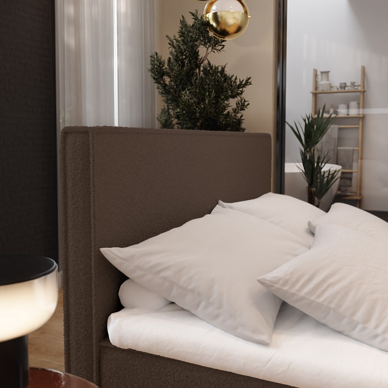 Klasyczna forma łóżka została tu podkreślona stylową tkaniną i wygodnym wezgłowiem, które zachęca do relaksu z książką czy porannej kawy. Wbudowany materac bonellowy odpowiada za komfortowy sen i odpowiednie podparcie kręgosłupa, a dla większej wygody możesz dołożyć opcjonalny topper – wyrównujący powierzchnię spania i ułatwiający utrzymanie czystości. Wnętrze łóżka kryje praktyczne pojemniki na pościel i inne domowe tekstylia, a solidne, niskie nóżki dodają mu nowoczesnej lekkości i stabilności.