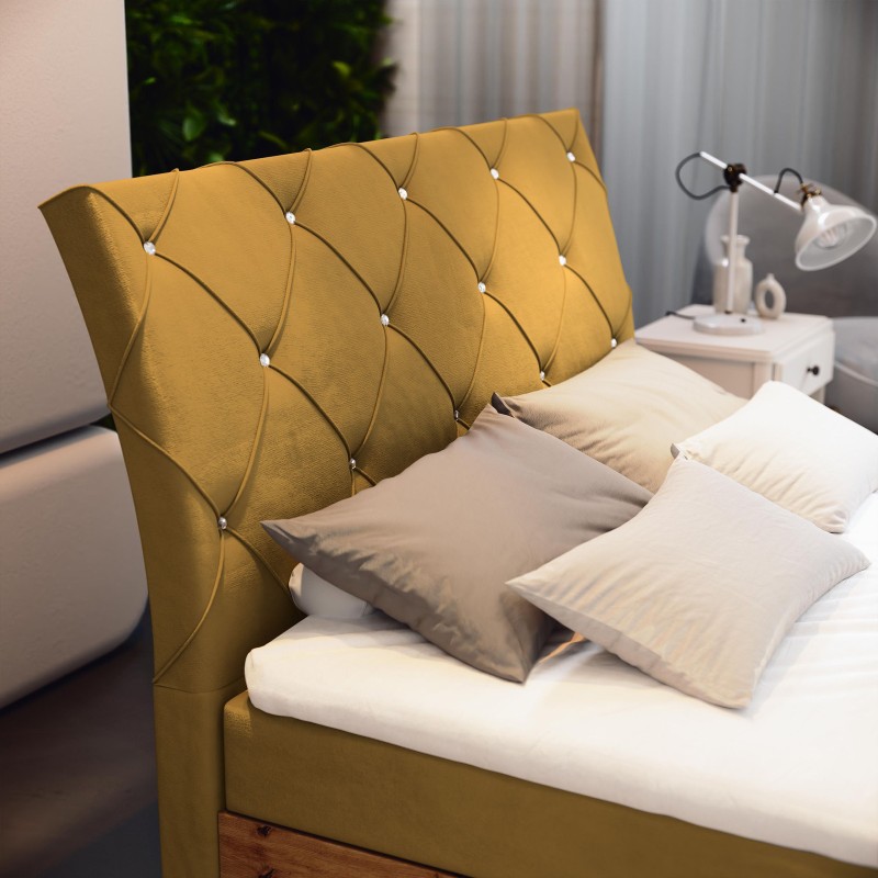 - Tapicerowane wezgłowie o delikatnie wygiętym kształcie dodaje charakteru i elegancji. Starannie wykonane pikowanie w formie diamentów podkreśla luksusowy styl i zapewnia wygodne oparcie.