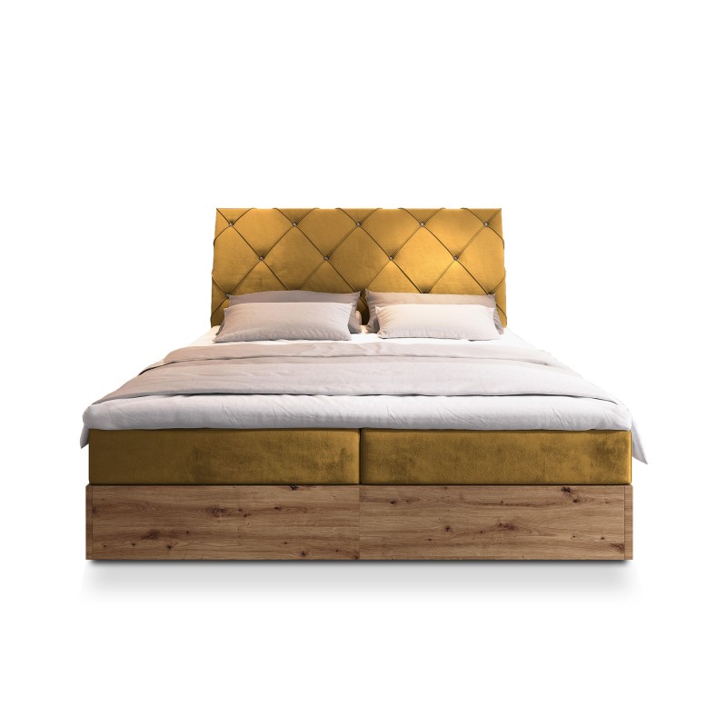 Solidna konstrukcja z laminowanej płyty w dekorze dąb artisan nadaje meblowi naturalny, ciepły wygląd, a tapicerowane elementy w tkaninie Kronos lub Paros dodają mu miękkości i przyjemnej w dotyku faktury. Stylowe wezgłowie z eleganckim pikowaniem w kształcie diamentów nie tylko przyciąga wzrok, ale także zapewnia wygodne podparcie dla pleców. Zintegrowane materace bonelowe gwarantują optymalne podparcie dla kręgosłupa, a dla wymagających użytkowników dostępna jest opcja dopłaty do materacy pocketowych, które lepiej dopasowują się do ciała. Dwa obszerne pojemniki na pościel i inne akcesoria zapewniają dodatkowe miejsce do przechowywania, pomagając utrzymać porządek w sypialni. Dwa osobne materace eliminują problem przenoszenia ruchów drugiej osoby, gwarantując niezakłócony i spokojny sen.