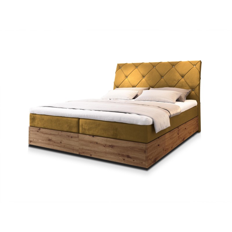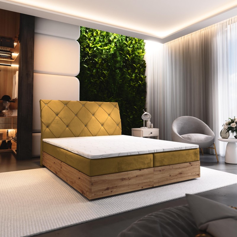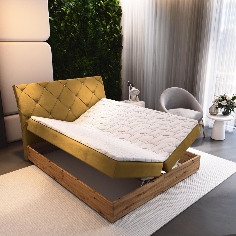 Solidna konstrukcja z laminowanej płyty w dekorze dąb artisan nadaje meblowi naturalny, ciepły wygląd, a tapicerowane elementy w tkaninie Kronos lub Paros dodają mu miękkości i przyjemnej w dotyku faktury. Stylowe wezgłowie z eleganckim pikowaniem w kształcie diamentów nie tylko przyciąga wzrok, ale także zapewnia wygodne podparcie dla pleców. Zintegrowane materace bonelowe gwarantują optymalne podparcie dla kręgosłupa, a dla wymagających użytkowników dostępna jest opcja dopłaty do materacy pocketowych, które lepiej dopasowują się do ciała. Dwa obszerne pojemniki na pościel i inne akcesoria zapewniają dodatkowe miejsce do przechowywania, pomagając utrzymać porządek w sypialni. Dwa osobne materace eliminują problem przenoszenia ruchów drugiej osoby, gwarantując niezakłócony i spokojny sen.