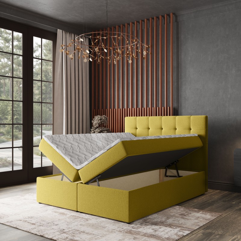 - Praktyczne rozwiązanie na co dzień: Dzięki wbudowanemu pojemnikowi na pościel, błyskawicznie schowasz kołdry i poduszki. Automat sprężynowy ułatwia otwieranie pojemnika od boku łóżka.