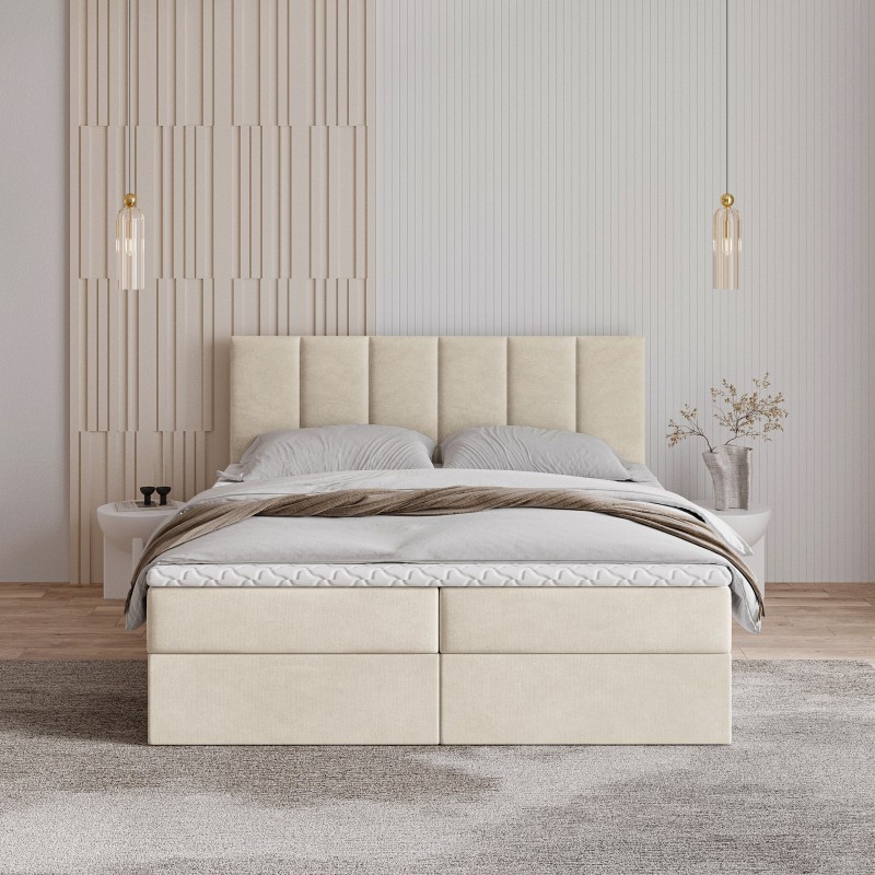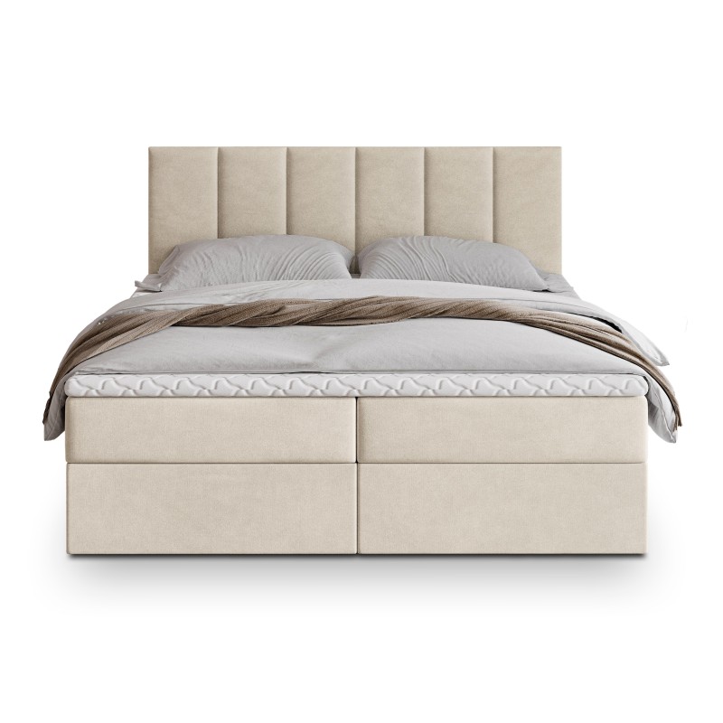 Serce łóżka stanowi materac bonellowy. To rozwiązanie, które zapewnia doskonałe podparcie sylwetki, odpowiednie rozłożenie ciężaru i komfortową pozycję przez całą noc. Dwa przestronne schowki umieszczone w podstawie łóżka bez trudu pomieszczą kołdry, poduszki, sezonową odzież czy inne domowe tekstylia.