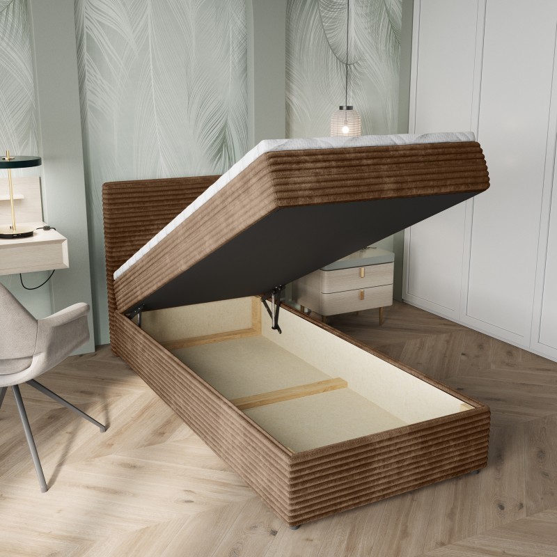 - Praktyczne rozwiązanie na co dzień: Dzięki wbudowanemu pojemnikowi na pościel, błyskawicznie schowasz kołdry i poduszki. Automat sprężynowy ułatwia otwieranie pojemnika od boku łóżka.