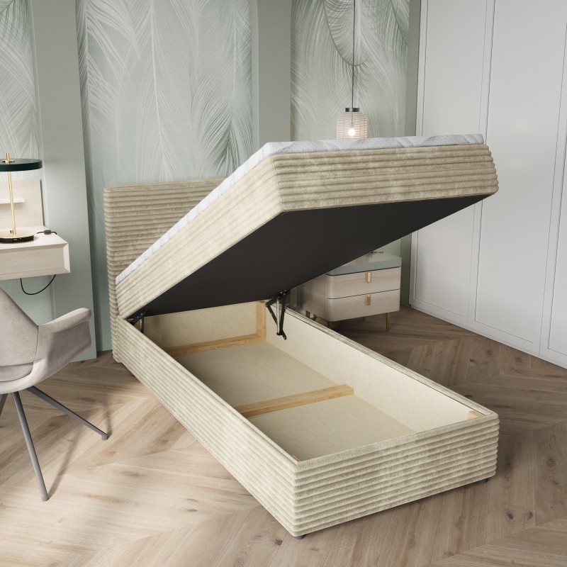 - Praktyczne rozwiązanie na co dzień: Dzięki wbudowanemu pojemnikowi na pościel, błyskawicznie schowasz kołdry i poduszki. Automat sprężynowy ułatwia otwieranie pojemnika od boku łóżka.