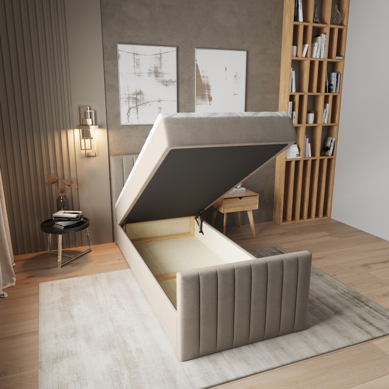 - Praktyczne rozwiązanie na co dzień: Dzięki wbudowanemu pojemnikowi na pościel, błyskawicznie schowasz kołdry i poduszki. Automat sprężynowy ułatwia otwieranie pojemnika od boku łóżka.