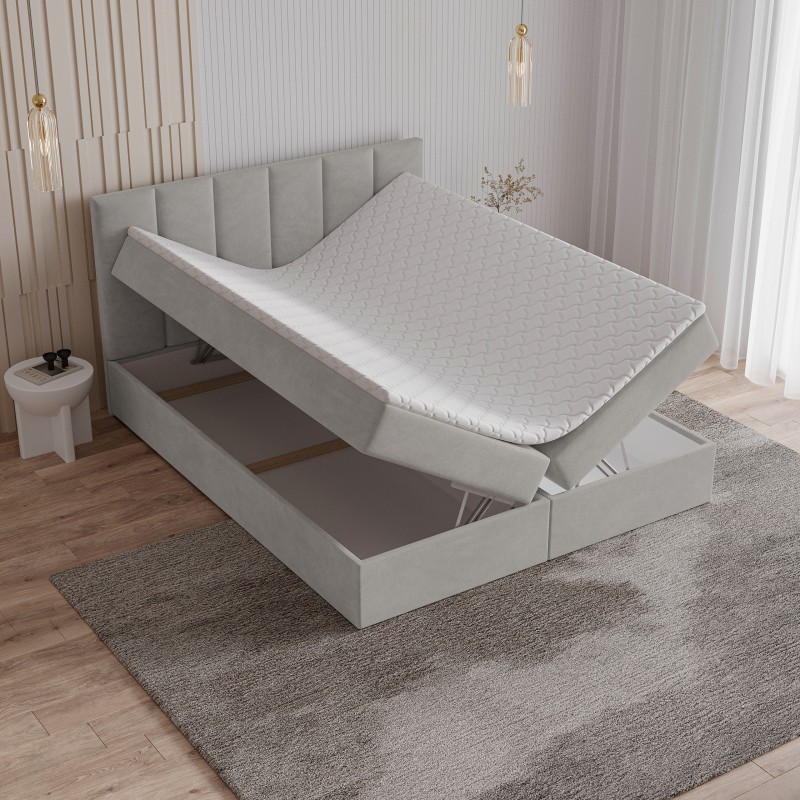 Serce łóżka stanowi materac bonellowy. To rozwiązanie, które zapewnia doskonałe podparcie sylwetki, odpowiednie rozłożenie ciężaru i komfortową pozycję przez całą noc. Dwa przestronne schowki umieszczone w podstawie łóżka bez trudu pomieszczą kołdry, poduszki, sezonową odzież czy inne domowe tekstylia.