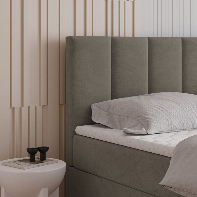 Serce łóżka stanowi materac bonellowy. To rozwiązanie, które zapewnia doskonałe podparcie sylwetki, odpowiednie rozłożenie ciężaru i komfortową pozycję przez całą noc. Dwa przestronne schowki umieszczone w podstawie łóżka bez trudu pomieszczą kołdry, poduszki, sezonową odzież czy inne domowe tekstylia.