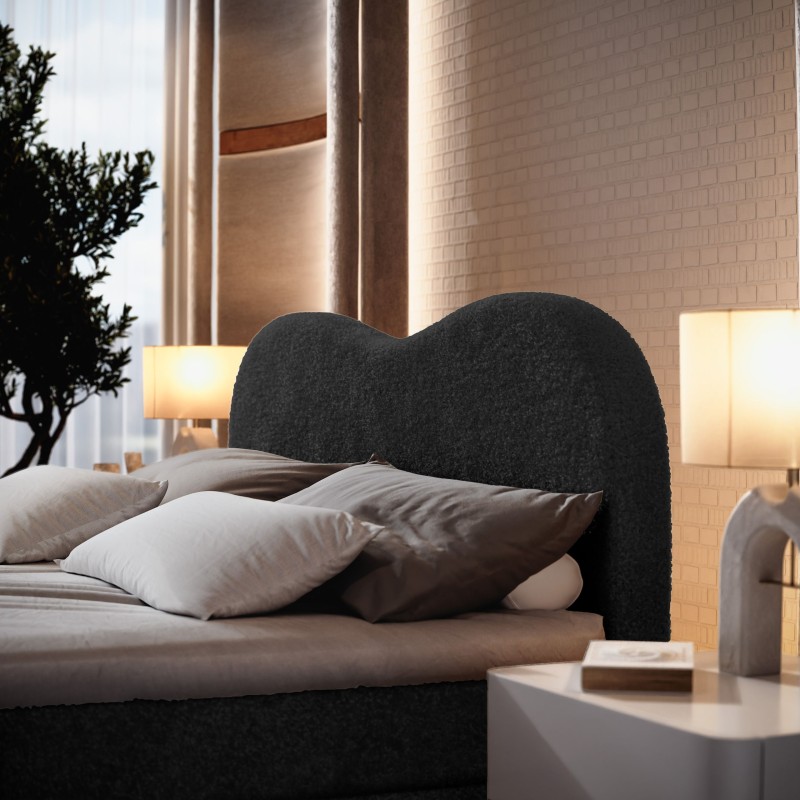 Tkanina Now or Never, którą obito łóżko, wyróżnia się charakterystyczną, pętelkową strukturą inspirowaną materiałami typu boucle. Jej unikalny wygląd nadaje meblowi przytulności, a przy tym jest niezwykle wytrzymała i odporna na mechacenie, co gwarantuje długowieczność nawet przy intensywnym użytkowaniu. Mięsista i gęsta faktura materiału sprawia, że łóżko prezentuje się luksusowo i zapewnia przyjemne doznania dotykowe. FLUVIA to nie tylko estetyka, ale także maksymalna funkcjonalność. Wbudowane pojemne schowki na pościel pozwalają na wygodne przechowywanie kołder, poduszek czy sezonowych tekstyliów, co pomaga utrzymać porządek w sypialni. Dzięki wysokiej jakości materacom, łóżko zapewnia optymalne wsparcie dla ciała, sprzyjając zdrowemu i regenerującemu snu.