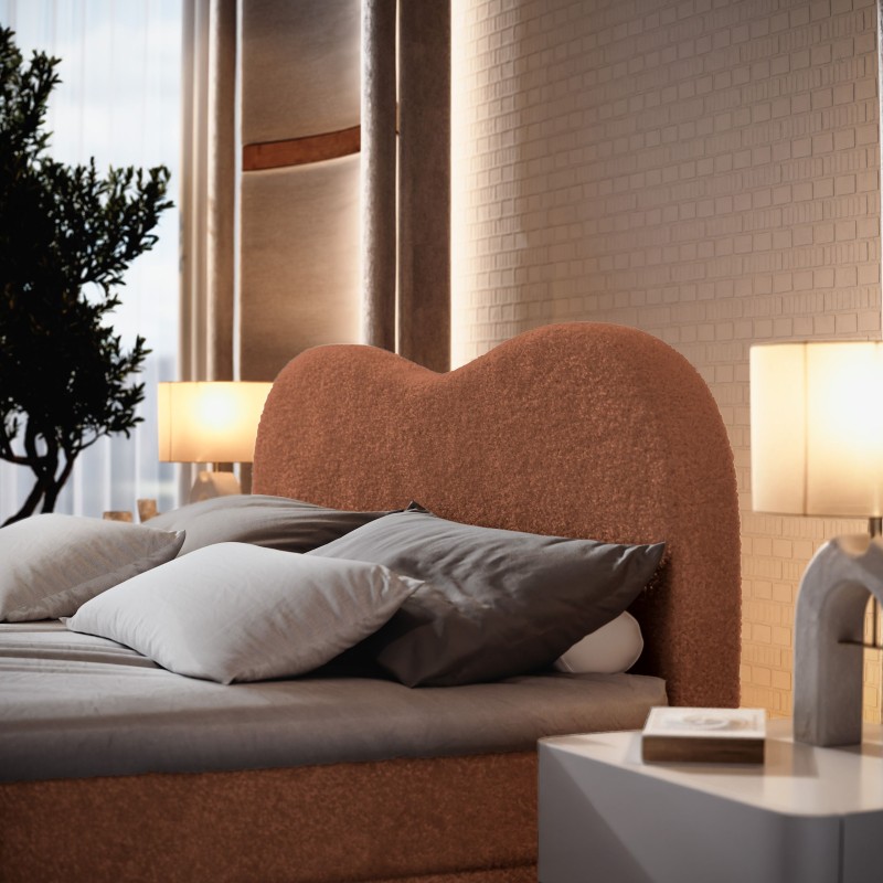 Tkanina Now or Never, którą obito łóżko, wyróżnia się charakterystyczną, pętelkową strukturą inspirowaną materiałami typu boucle. Jej unikalny wygląd nadaje meblowi przytulności, a przy tym jest niezwykle wytrzymała i odporna na mechacenie, co gwarantuje długowieczność nawet przy intensywnym użytkowaniu. Mięsista i gęsta faktura materiału sprawia, że łóżko prezentuje się luksusowo i zapewnia przyjemne doznania dotykowe. FLUVIA to nie tylko estetyka, ale także maksymalna funkcjonalność. Wbudowane pojemne schowki na pościel pozwalają na wygodne przechowywanie kołder, poduszek czy sezonowych tekstyliów, co pomaga utrzymać porządek w sypialni. Dzięki wysokiej jakości materacom, łóżko zapewnia optymalne wsparcie dla ciała, sprzyjając zdrowemu i regenerującemu snu.