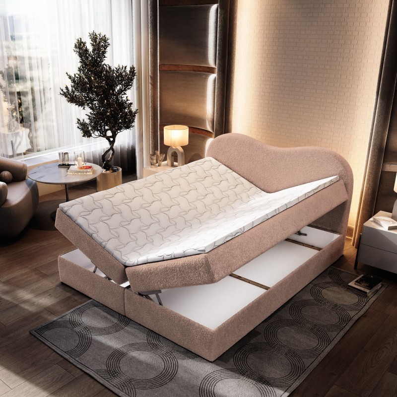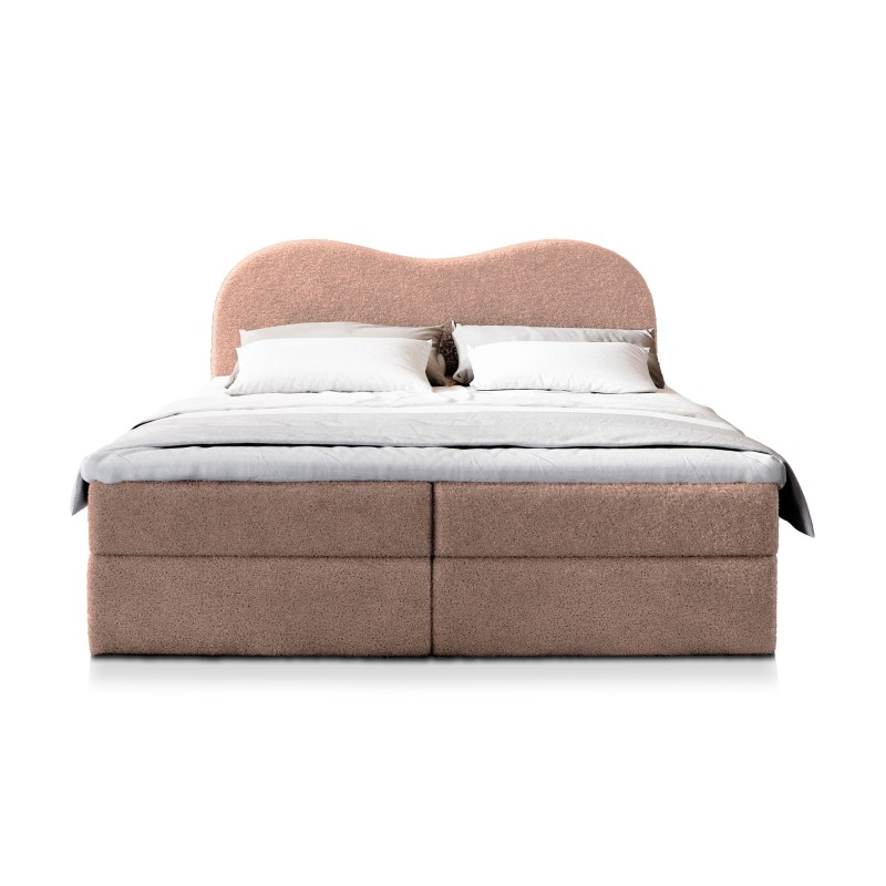 Tkanina Now or Never, którą obito łóżko, wyróżnia się charakterystyczną, pętelkową strukturą inspirowaną materiałami typu boucle. Jej unikalny wygląd nadaje meblowi przytulności, a przy tym jest niezwykle wytrzymała i odporna na mechacenie, co gwarantuje długowieczność nawet przy intensywnym użytkowaniu. Mięsista i gęsta faktura materiału sprawia, że łóżko prezentuje się luksusowo i zapewnia przyjemne doznania dotykowe. FLUVIA to nie tylko estetyka, ale także maksymalna funkcjonalność. Wbudowane pojemne schowki na pościel pozwalają na wygodne przechowywanie kołder, poduszek czy sezonowych tekstyliów, co pomaga utrzymać porządek w sypialni. Dzięki wysokiej jakości materacom, łóżko zapewnia optymalne wsparcie dla ciała, sprzyjając zdrowemu i regenerującemu snu.