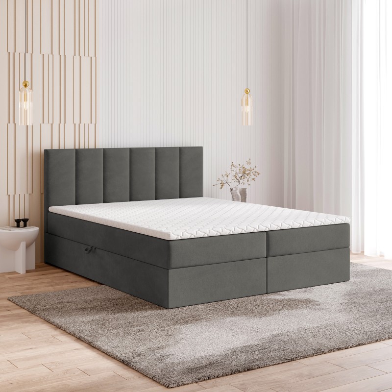 Serce łóżka stanowi materac bonellowy. To rozwiązanie, które zapewnia doskonałe podparcie sylwetki, odpowiednie rozłożenie ciężaru i komfortową pozycję przez całą noc. Dwa przestronne schowki umieszczone w podstawie łóżka bez trudu pomieszczą kołdry, poduszki, sezonową odzież czy inne domowe tekstylia.