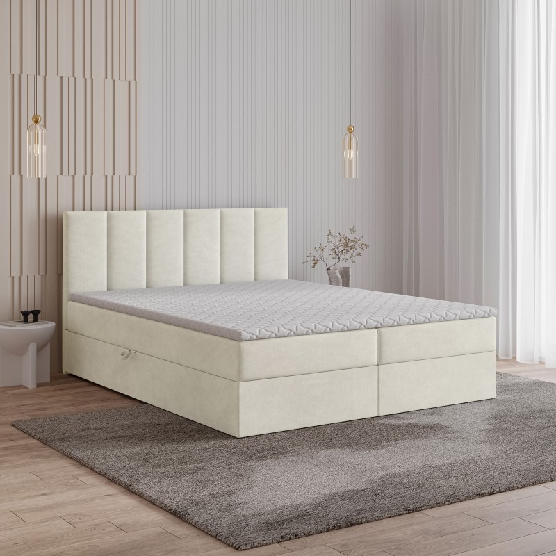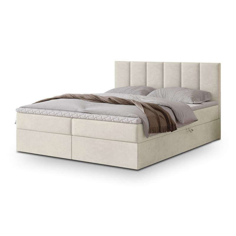 Serce łóżka stanowi materac bonellowy. To rozwiązanie, które zapewnia doskonałe podparcie sylwetki, odpowiednie rozłożenie ciężaru i komfortową pozycję przez całą noc. Dwa przestronne schowki umieszczone w podstawie łóżka bez trudu pomieszczą kołdry, poduszki, sezonową odzież czy inne domowe tekstylia.