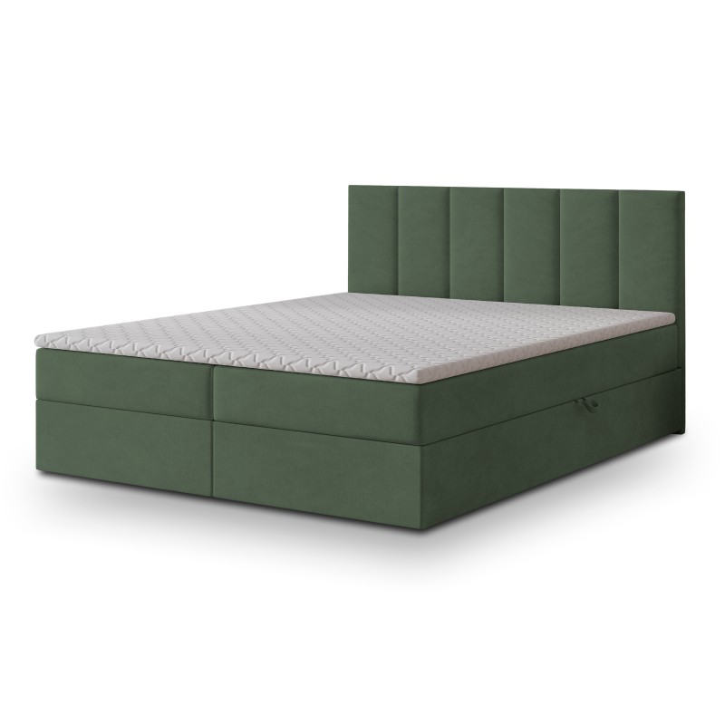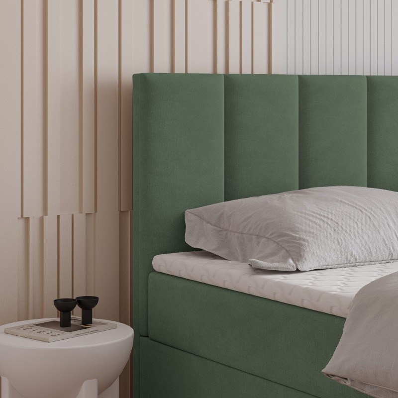 Serce łóżka stanowi materac bonellowy. To rozwiązanie, które zapewnia doskonałe podparcie sylwetki, odpowiednie rozłożenie ciężaru i komfortową pozycję przez całą noc. Dwa przestronne schowki umieszczone w podstawie łóżka bez trudu pomieszczą kołdry, poduszki, sezonową odzież czy inne domowe tekstylia.