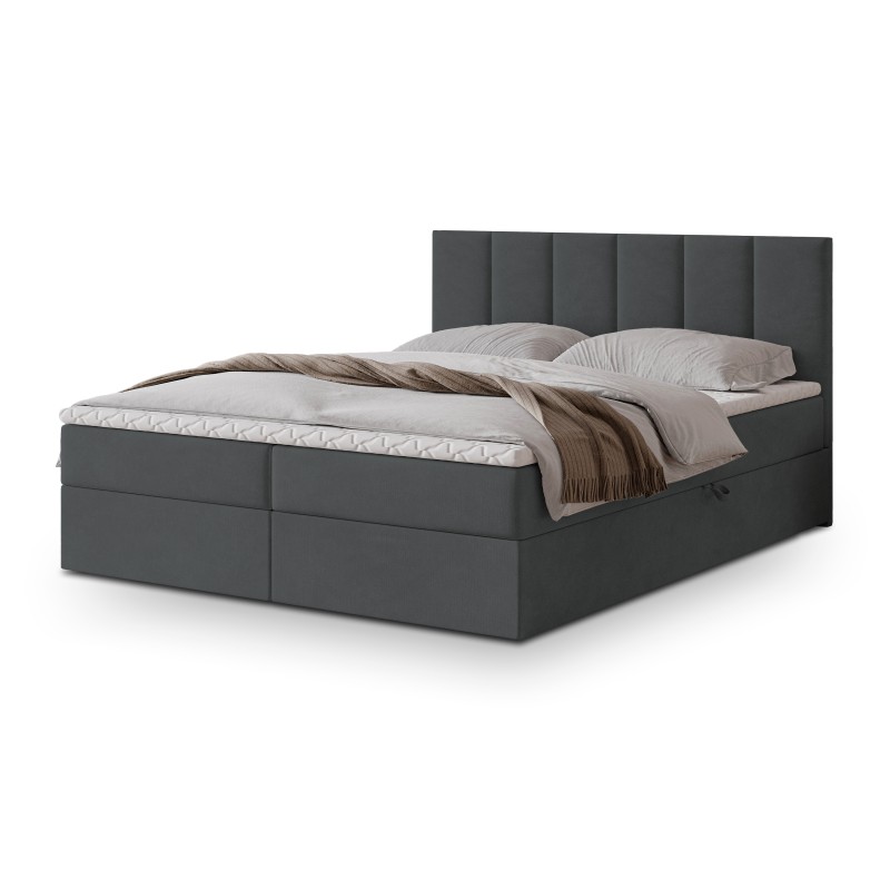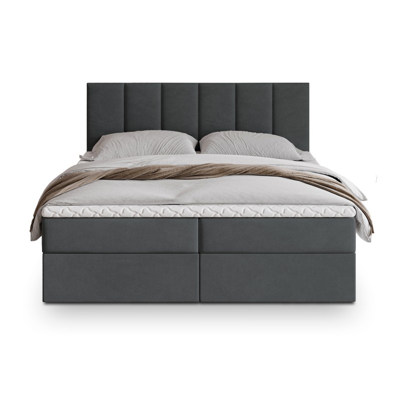 Serce łóżka stanowi materac bonellowy. To rozwiązanie, które zapewnia doskonałe podparcie sylwetki, odpowiednie rozłożenie ciężaru i komfortową pozycję przez całą noc. Dwa przestronne schowki umieszczone w podstawie łóżka bez trudu pomieszczą kołdry, poduszki, sezonową odzież czy inne domowe tekstylia.