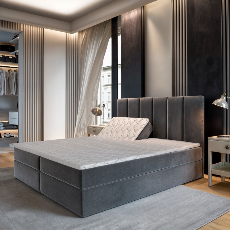 Łóżko kontynentalne, które łączy elegancję z nowoczesnym designem. Ten wyjątkowy mebel przyciąga wzrok szerokimi panelami z pionowymi przeszyciami, które nadają mu niepowtarzalny charakter. Tapicerka wykonana z modnej tkaniny Kronos, będącej połączeniem pluszu i weluru, zapewnia nie tylko luksusowy wygląd, ale również niezwykłą miękkość i przyjemność w dotyku.