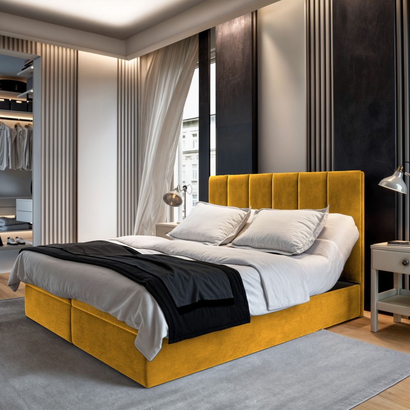 Łóżko kontynentalne, które łączy elegancję z nowoczesnym designem. Ten wyjątkowy mebel przyciąga wzrok szerokimi panelami z pionowymi przeszyciami, które nadają mu niepowtarzalny charakter. Tapicerka wykonana z modnej tkaniny Kronos, będącej połączeniem pluszu i weluru, zapewnia nie tylko luksusowy wygląd, ale również niezwykłą miękkość i przyjemność w dotyku.