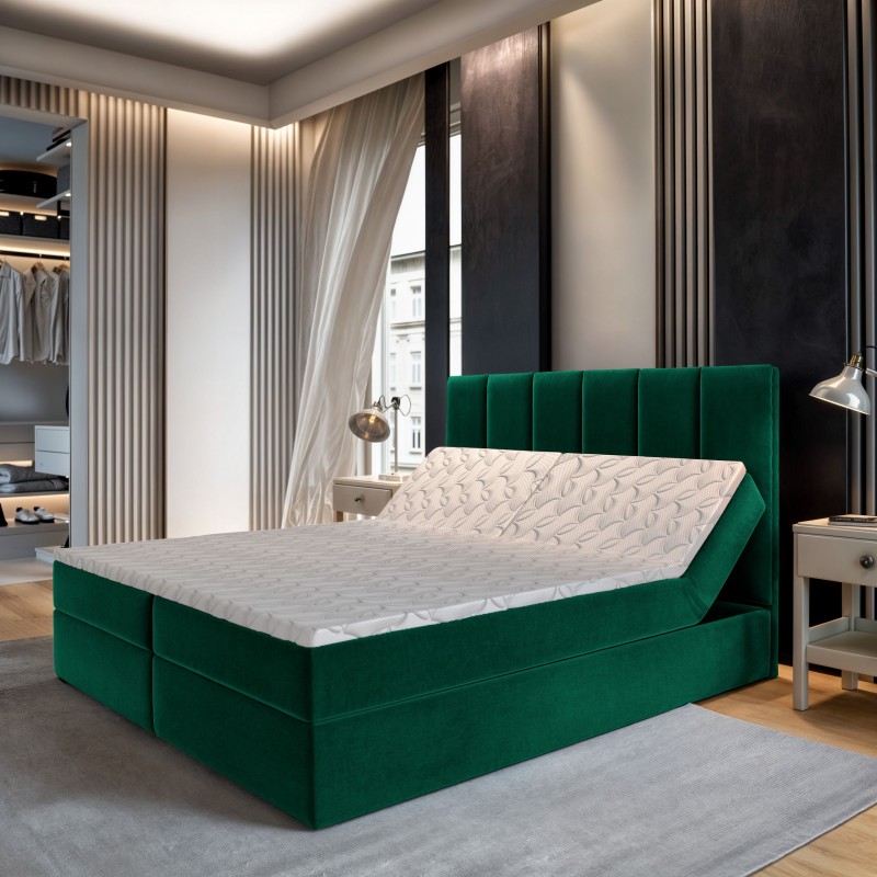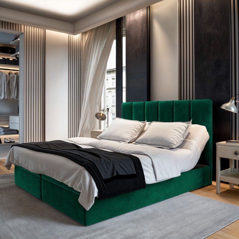 Łóżko kontynentalne, które łączy elegancję z nowoczesnym designem. Ten wyjątkowy mebel przyciąga wzrok szerokimi panelami z pionowymi przeszyciami, które nadają mu niepowtarzalny charakter. Tapicerka wykonana z modnej tkaniny Kronos, będącej połączeniem pluszu i weluru, zapewnia nie tylko luksusowy wygląd, ale również niezwykłą miękkość i przyjemność w dotyku.