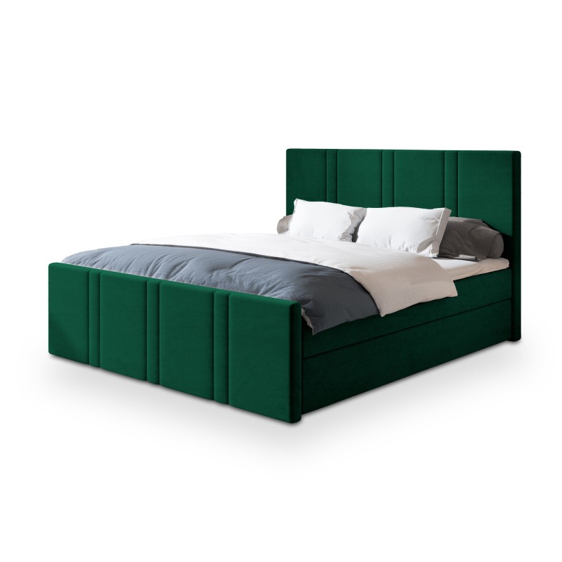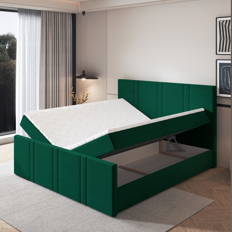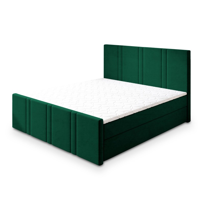 Obicie wykonane zostało z przyjemnej w dotyku tkaniny KRONOS, która urzeka miękkością i subtelnym połyskiem. Ten aksamitny materiał nie tylko pięknie się prezentuje, ale także jest odporny na ścieranie i mechacenie, co gwarantuje trwałość przez długie lata. COMOZA to również łóżko o podwyższonej konstrukcji, co sprawia, że wstawanie z niego staje się wygodne i bardziej ergonomiczne – szczególnie doceniane na co dzień. W łóżku znajdują się zintegrowane materace bonellowe, które zapewniają odpowiednie podparcie i sprężystość. Dla osób oczekujących jeszcze większego komfortu, istnieje możliwość wymiany ich na materace pocketowe. Dodatkowo pod strefą spania ukryto praktyczne pojemniki, w których z łatwością przechowasz pościel, koce lub sezonową garderobę.