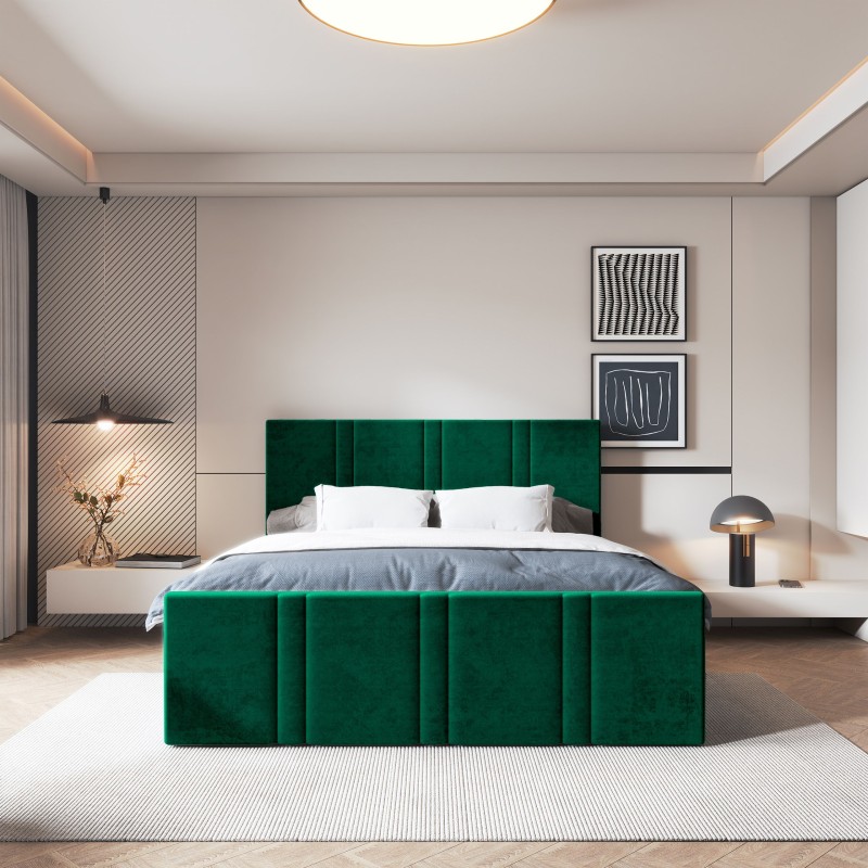 - Tapicerowany przód – dopracowana forma z każdej strony. Przód łóżka również został wykończony tkaniną i ozdobiony pionowymi przeszyciami, co podkreśla spójną, elegancką estetykę całej konstrukcji. To rozwiązanie idealne do nowoczesnych i stylowych wnętrz.