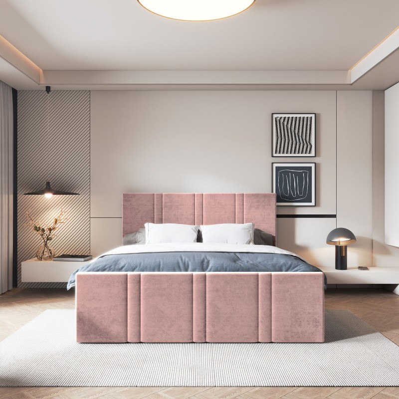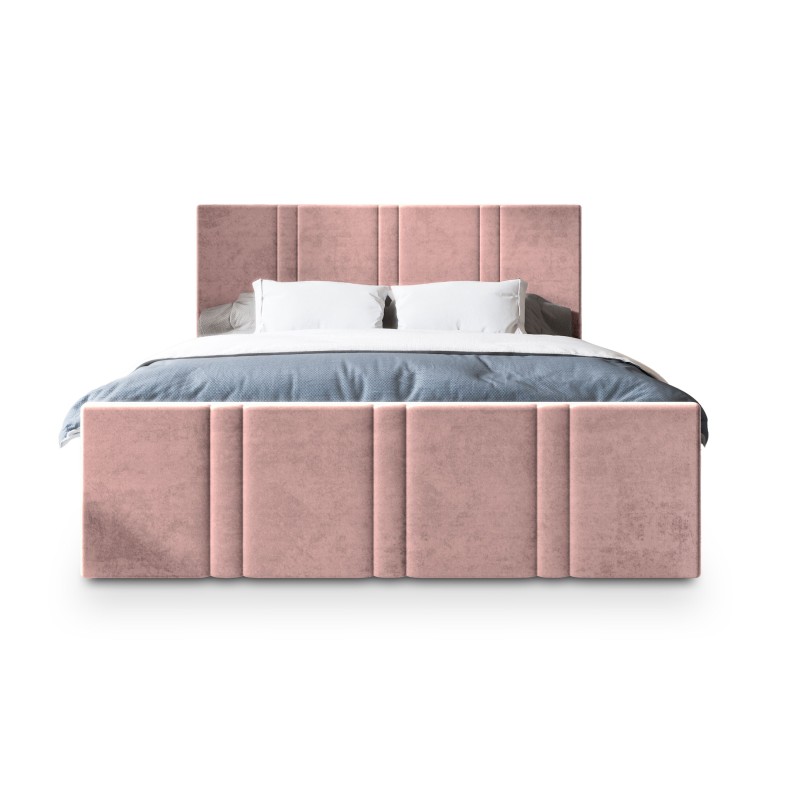 - Tapicerowany przód – dopracowana forma z każdej strony. Przód łóżka również został wykończony tkaniną i ozdobiony pionowymi przeszyciami, co podkreśla spójną, elegancką estetykę całej konstrukcji. To rozwiązanie idealne do nowoczesnych i stylowych wnętrz.