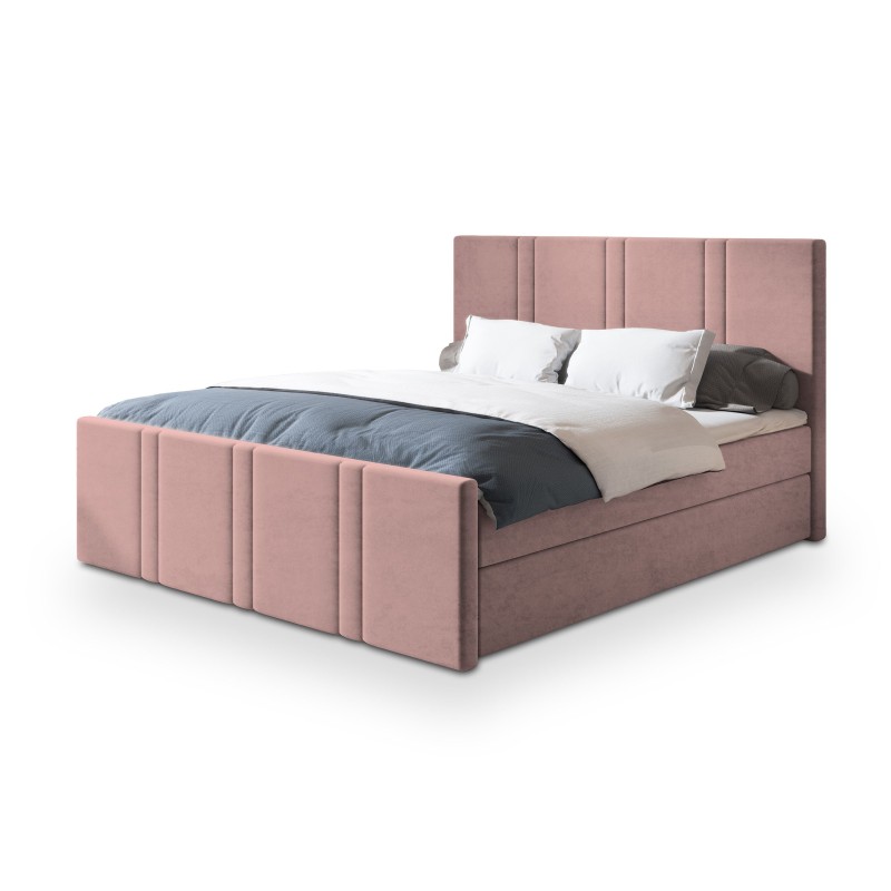 Obicie wykonane zostało z przyjemnej w dotyku tkaniny KRONOS, która urzeka miękkością i subtelnym połyskiem. Ten aksamitny materiał nie tylko pięknie się prezentuje, ale także jest odporny na ścieranie i mechacenie, co gwarantuje trwałość przez długie lata. COMOZA to również łóżko o podwyższonej konstrukcji, co sprawia, że wstawanie z niego staje się wygodne i bardziej ergonomiczne – szczególnie doceniane na co dzień. W łóżku znajdują się zintegrowane materace bonellowe, które zapewniają odpowiednie podparcie i sprężystość. Dla osób oczekujących jeszcze większego komfortu, istnieje możliwość wymiany ich na materace pocketowe. Dodatkowo pod strefą spania ukryto praktyczne pojemniki, w których z łatwością przechowasz pościel, koce lub sezonową garderobę.