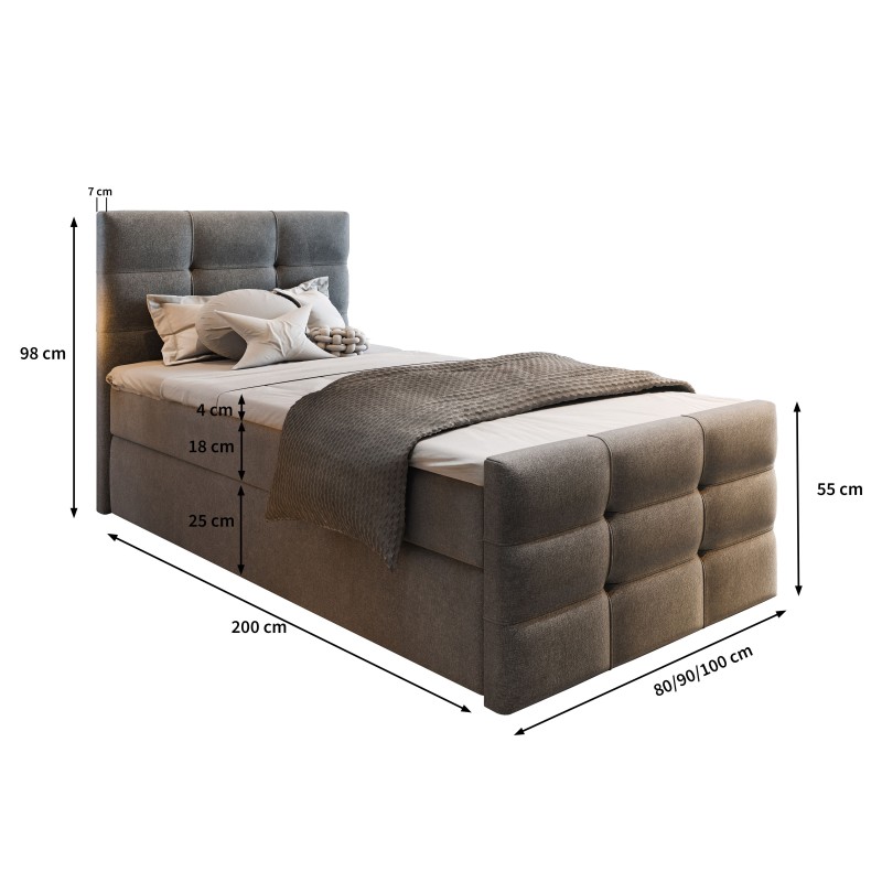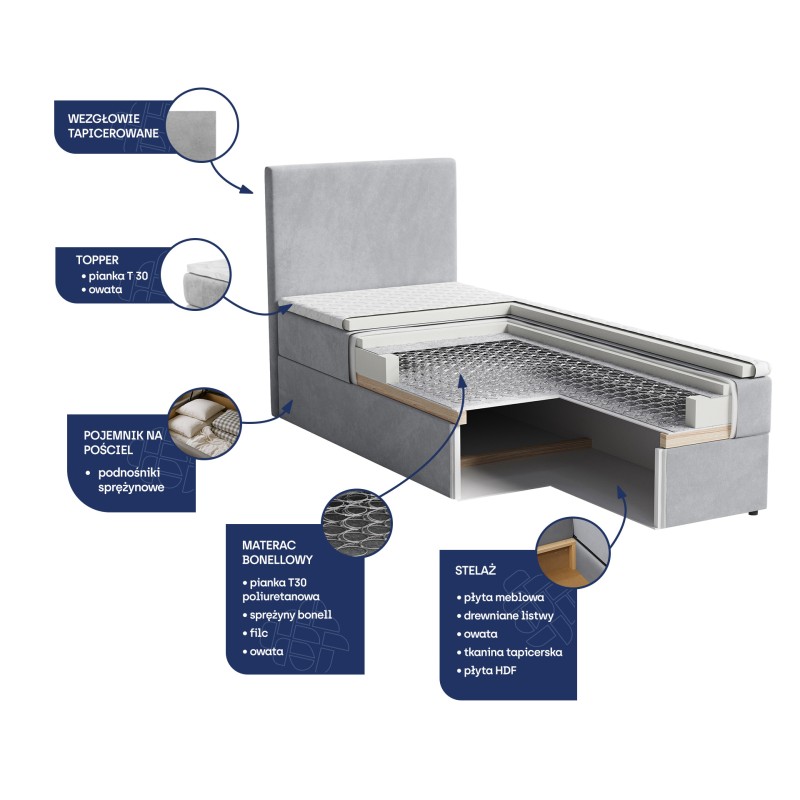 Łóżko pojedyncze posiada przymocowany do skrzyni wygodny materac wykonany przy użyciu sprężyn bonell, gwarantujący doskonałe wsparcie dla Twojego ciała podczas snu. Dodatkowo, Łóżko pojedyncze wyróżnia się swoją wysokością, przewyższającą standardowe łóżka tapicerowane. Niskie nóżki dodają stabilności całej konstrukcji, tworząc harmonijną równowagę pomiędzy funkcjonalnością, a designem.