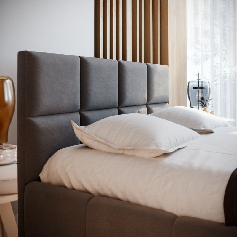- Estetyczne i stylowe wykończenie łóżka, z prostokątnymi symetrycznymi przeszyciami, przyciąga uwagę i nadaje sypialni wyjątkowy charakter.