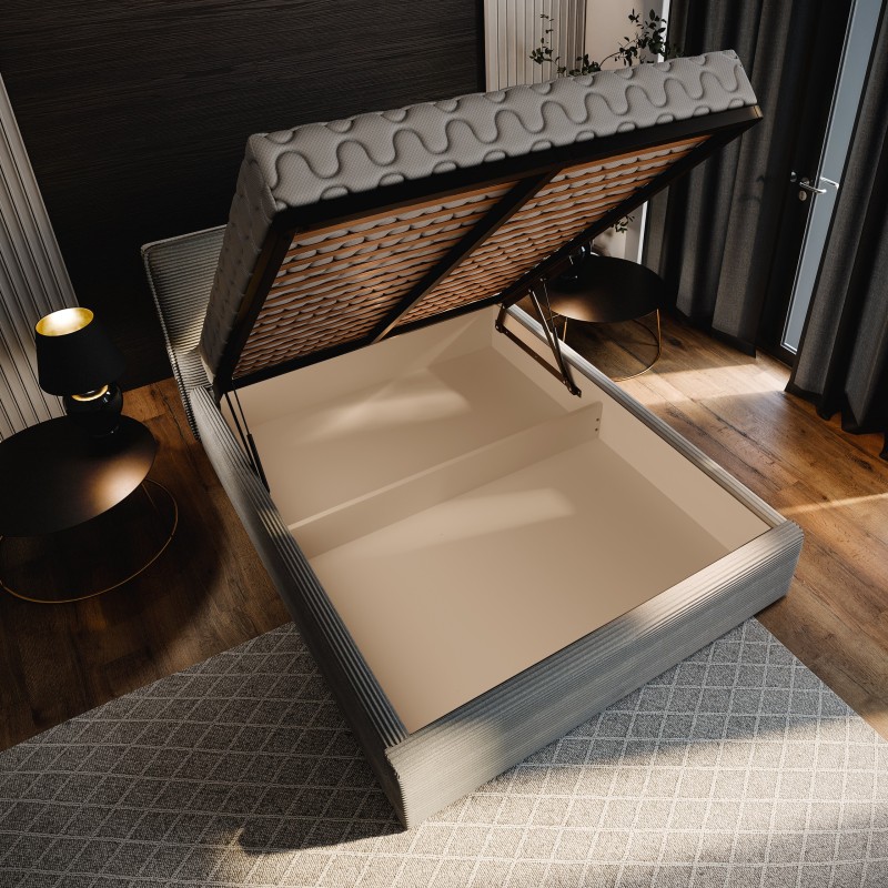 - W podstawowej cenie mebla znajduje się podnoszony stelaż z metalową ramą, wypełniają go elastyczne listwy. Taka opcja nie tylko wydłuża trwałość materaca, lecz także zapewnia większy komfort użytkowania i dodatkową przestrzeń do przechowywania pod łóżkiem.
