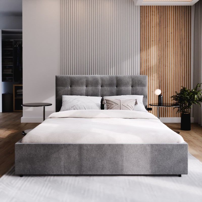 - W standardowej cenie mebla znajduje się podnoszony stelaż z metalową ramą, wypełniają go elastyczne listwy. Taka opcja nie tylko wydłuża trwałość materaca, lecz także zapewnia większy komfort użytkowania i dodatkową przestrzeń do przechowywania pod łóżkiem.