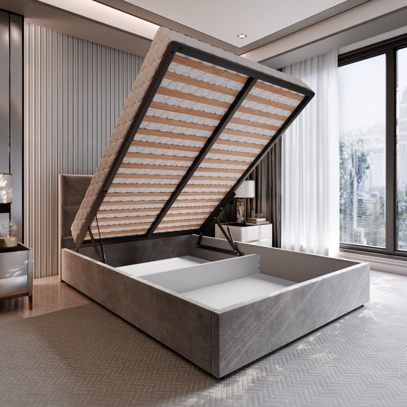 - W standardowej cenie mebla znajduje się podnoszony stelaż z metalową ramą, wypełniają go elastyczne listwy. Taka opcja nie tylko wydłuża trwałość materaca, lecz także zapewnia większy komfort użytkowania i dodatkową przestrzeń do przechowywania pod łóżkiem.
