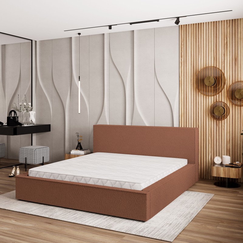 - Obicie wykonano z modnej tkaniny bouclé, której pętelkowa struktura jest zarówno wyrazista, jak i przyjemna w dotyku. Materiał ten dodaje wnętrzu ciepła i nowoczesnego charakteru, sprawiając, że łóżko staje się centralnym punktem pomieszczenia.