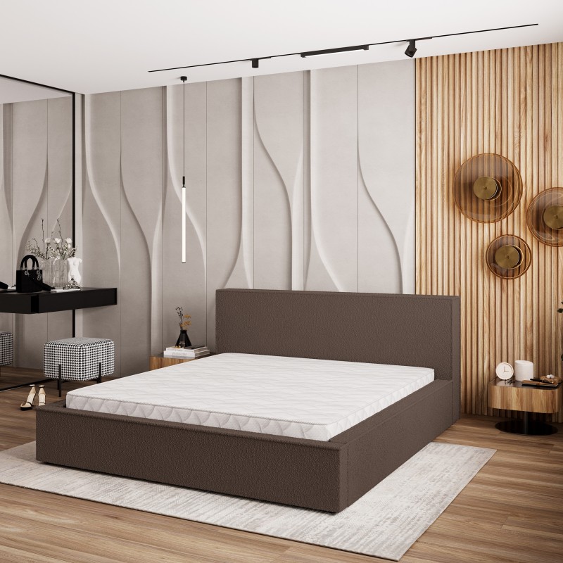 - Obicie wykonano z modnej tkaniny bouclé, której pętelkowa struktura jest zarówno wyrazista, jak i przyjemna w dotyku. Materiał ten dodaje wnętrzu ciepła i nowoczesnego charakteru, sprawiając, że łóżko staje się centralnym punktem pomieszczenia.