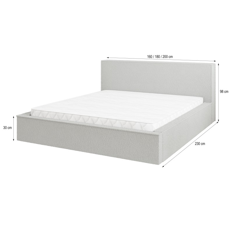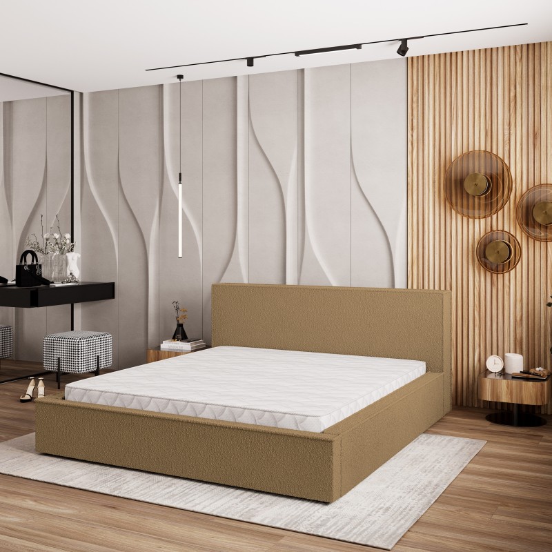 - Obicie wykonano z modnej tkaniny bouclé, której pętelkowa struktura jest zarówno wyrazista, jak i przyjemna w dotyku. Materiał ten dodaje wnętrzu ciepła i nowoczesnego charakteru, sprawiając, że łóżko staje się centralnym punktem pomieszczenia.