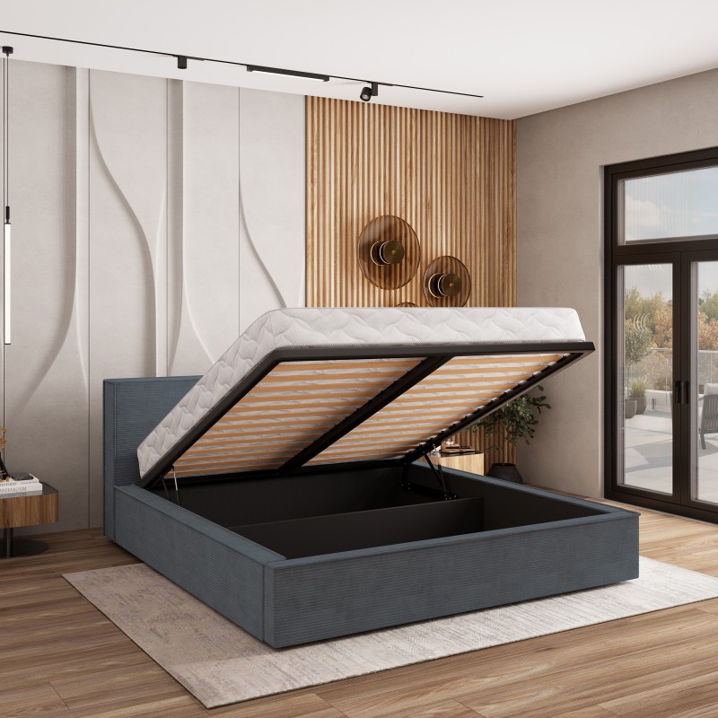 - Przestronny pojemnik pozwala przechowywać kołdry, poduszki i inne tekstylia, zachowując porządek w sypialni. Wyposażony w mechanizm wspomagający unoszenie, dzięki czemu korzystanie ze schowka jest wygodne i bezpieczne.