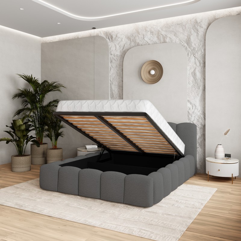 Tkanina Quelle to miękka bouclé o wyrazistej, pętelkowej strukturze. Przyjemna w dotyku, a jednocześnie niezwykle stylowa, doskonale wpisuje się w aktualne trendy wnętrzarskie. Jej nowoczesny, lekko surowy charakter łączy się z przytulnością, sprawiając, że łóżko FALINA pasuje zarówno do wnętrz modernistycznych, jak i tych inspirowanych stylem skandynawskim czy loftowym. Model FALINA to jednak nie tylko wyjątkowy design, ale także praktyczne rozwiązania. Łóżko wyposażono w obszerny schowek na pościel, otwierany za pomocą podnoszonego stelaża z mechanizmem wspomagającym. Spód pojemnika został wykończony tkaniną, co nie tylko dodaje estetyki, ale także zabezpiecza podłogę pod łóżkiem. Dzięki temu korzystanie ze schowka jest wygodne, bezpieczne i funkcjonalne.